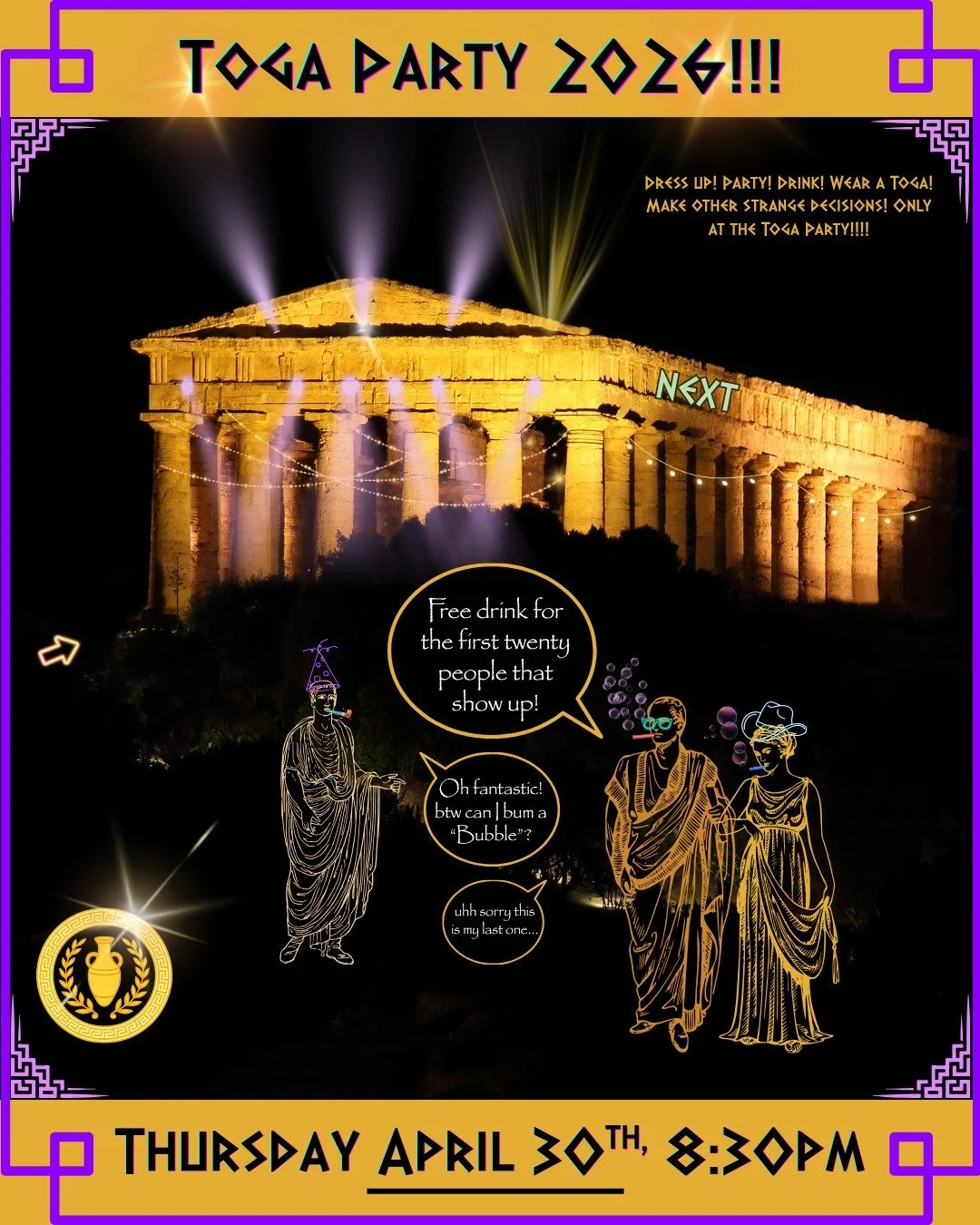 People from the senate, citizens and friends, Reuvens invites you to the annual TOGA PARTY.